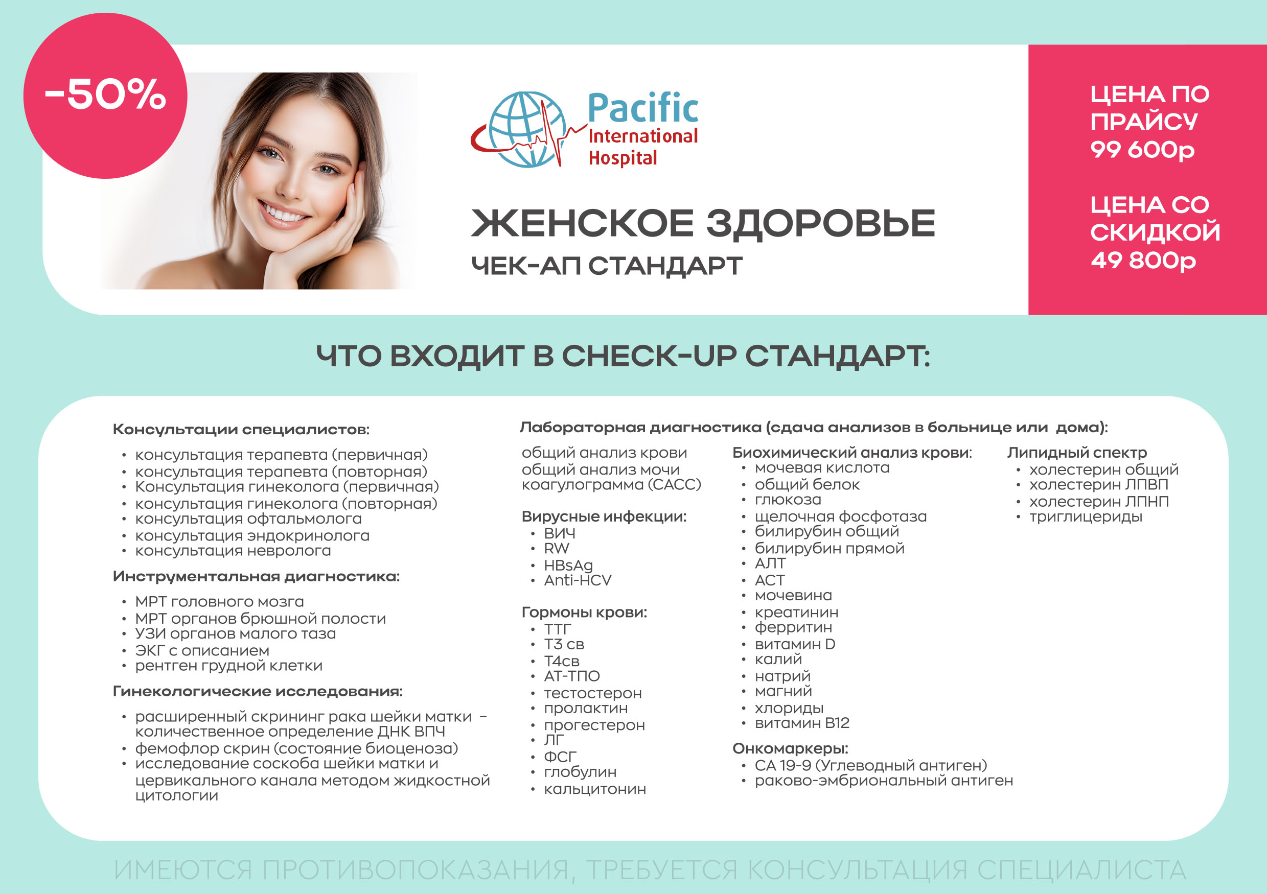Специалистами больницы Пасифик разработаны чек-ап программы для полного обследования организма. Комплексный подход помогает диагностировать опасные заболевания на самой ранней стадии.