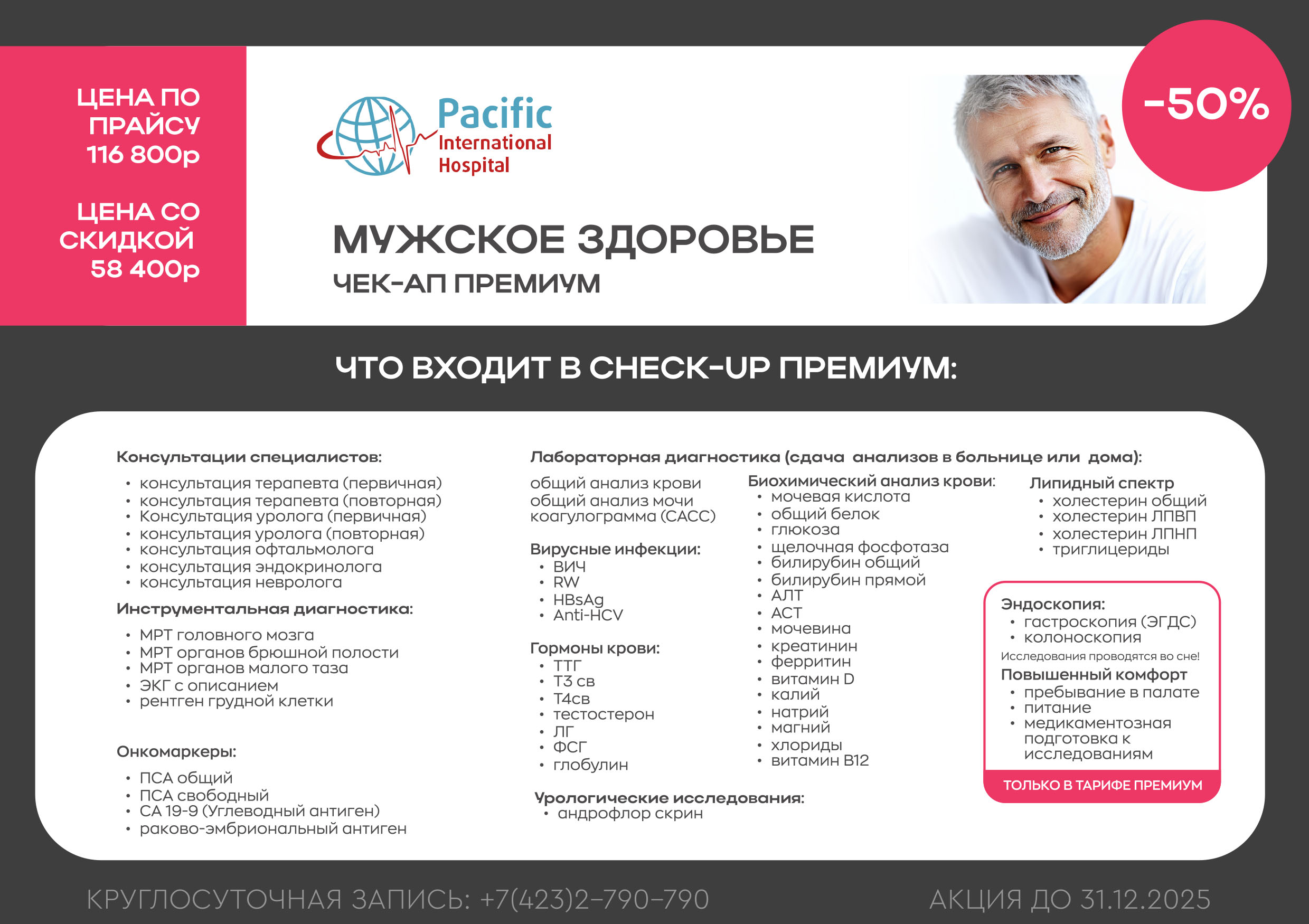 Скидка 50% на чек-ап "МУЖСКОЕ ЗДОРОВЬЕ" и "ЖЕНСКОЕ ЗДОРОВЬЕ" во Владивостоке.